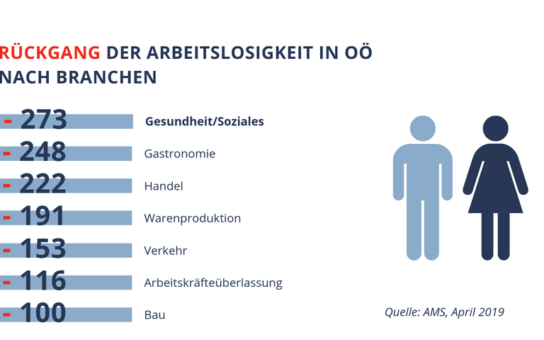 Die Arbeitslosenquote lag im April 2019 in Oberösterreich bei 4,3 %. Der Rückgang der Arbeitslosigkeit spiegelte sich in allen größeren Branchen wider. Den stärksten Rückgang bei den Arbeitslosen gab es im Bereich Gesundheit und Soziales (-273).